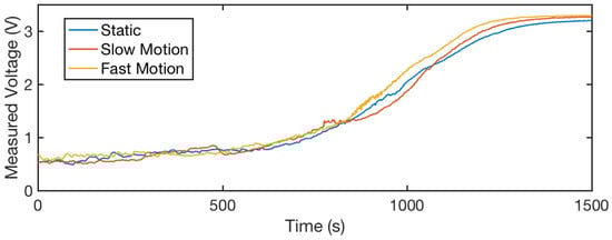 Thread readings during the evaporation process. We show the comparison between different levels of motion applied to the sensor, as discussed in Figure 9. We observe that under static, slow and fast motion, the sensor shows similar profiling in the evaporation process. This indicates that our sensor is robust to motion-caused distortion.