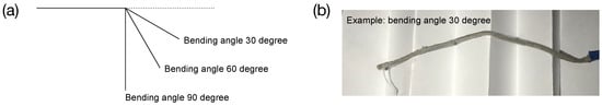 Sensor characterization with sharp static sensor bending: (a) the bending angle and its corresponding sensor position; and (b) a photo of the sensor with a bending angle of 30 during the experiment.