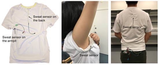 As discussed in Section 6, the system outputs two types of sweat level information: the measured sweat quantity and the perceived perspiration levels. We conducted multiple trials of exercise experiments on one participant and used their historical perceived perspiration level to build a prediction model. We applied the prediction model to the testing data and calculated the prediction error to evaluate the system performance. To investigate the sweating behavior of a human subject, we sewed two sensors (10 cm each) into the back and armpit of a shirt, as shown in Figure 15. The armpit and back are two of the sweatiest parts of the body because there are a relatively high density of sweat glands there.