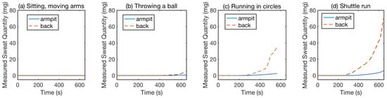 We selected four activities as representatives of four different activity levels: (1) moving arms; (2) throwing a ball; (3) running in a circle; and (4) shuttle run. We used our system to detect sweating profiles on the human subject while they performed these activities. The arm moving is the mildest activity. Therefore, after 650 s, readings from both sensors are still around 0 mg, as shown in Figure 16a. When the participant throws a ball, the activity level is higher, which causes the back and armpit sensor readings to increase after 500 s of activity, as shown in Figure 16b. For more intense activity (e.g., running), the sensor reading starts to increase even earlier—around 300 s after the participant begins the activity—as shown in Figure 16c,d. However, for the two different types of running, even though the participant experiences different levels of activity intensity, the measured sweat sensor readings show similar change trends and rates. Based on information from the personal trainer we consulted, the duration of the exercise affects the sweat rate and quantity more than intensity, which explains why the intensity of the exercise does not correlate to the measured sweat quantity.