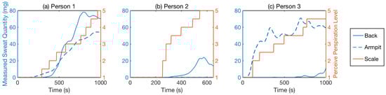 Perceived perspiration level based on people’s lived experience ((a–c) represent three different people). The x-axis is the time from the moment they start to exercise until they stop. The solid blue lines are the measured sweat quantity (mg) for the sensor on the back. Blue dash lines are the measured sweat quantity (ms) for the sensor at the armpit. The red line is their perceived perspiration level, as listed in Table 2 [].