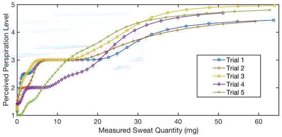 Even though the trials show different characteristics, the overall trends are similar, and the perceived perspiration level difference for the same measured sweat quantity is mainly within one level. Therefore, we further utilized one trial as the testing data and the rest as the training data to conduct predictions using the kernel smooth regression model built upon the training data. When we conducted cross-validation, the average perceived perspiration level estimation error was with a standard deviation of .