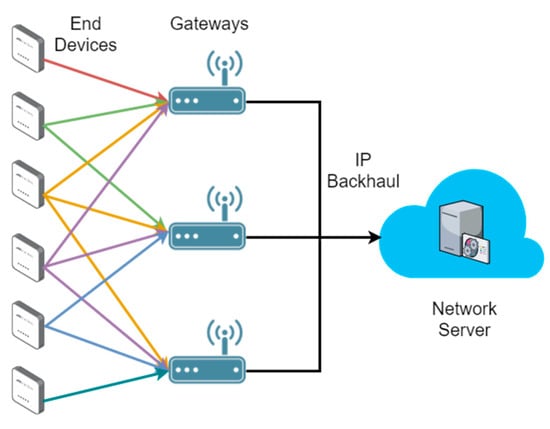 LoRaWAN network architecture. An end device may be associated with more than one gateway. Adapted from [].