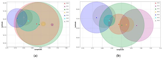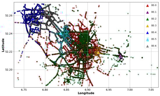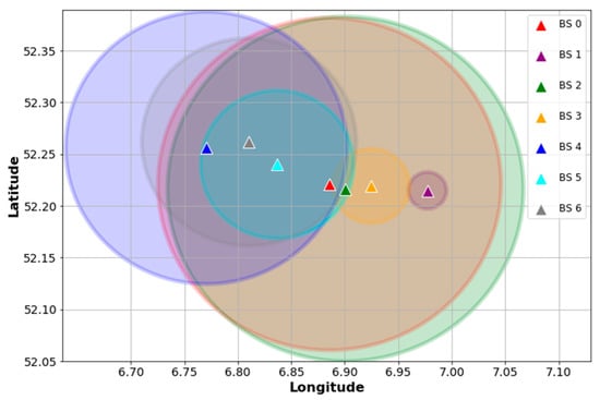 Since the files contain raw data, the first step is to clean and select the entries that are useful for our problem. To this end, we searched for data corresponding to an urban area taking into account the following considerations: (1) the BS with the highest number of received packets is the reference BS; (2) other BS are selected within a 10 km radius of the reference BS; (3) as end devices are mobile, only entries with location information of devices are considered; and (4) every BS is associated with two or more devices, thereby avoiding “dedicated” BS in the analysis. The resulting data is a subset of 261,576 samples, corresponding to seven BS. Figure 2 depicts the locations of the found BS and their devices in order to visualize how they are distributed and associated. Similarly, Figure 3 shows an idealization of the BS coverage based on their associated devices’ locations. As can be seen, the data points show an urban scenario where some gateways behave like SBS and others like MBS. For example, BS 1 and BS 3 have shorter coverage ranges compared with the other gateways and their devices might be associated with BS 0 or BS 2, as well. Therefore, the selected data is suitable for our scheme and is consistent with our hypothesis of treating an urban dense IoT network as a HetNet.