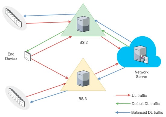 Moreover, it is also important to highlight that the LoRaWAN standard lets an end device be concurrently associated with more than one BS (i.e., gateway) [], as shown in Figure 1. We take into account this characteristic to evaluate the performance of our load balancing scheme. In this way, to be consistent with the standard, our goal is to determine what BS should transmit the downlink (DL) message to an end device, once an uplink (UL) message is received through more than one BS. This procedure is not defined by the LoRaWAN specifications and a network operator has to choose an optimal mechanism for it. Therefore, we consider a number of Class A end devices transmitting confirmed UL packets, i.e., packets that need to be acknowledged (ACK), and a network server that must make decisions on which gateways should relay the DL packets to end devices.