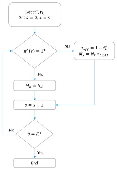 Another point to consider is that we define the quantity of DL traffic offloading based on the classifier outputs to avoid that any BS ends up with no packets to transmit. As a result, the quantity of end devices to be offloaded from a BS, that is , depends not only on but also on , as shown in Figure 5. In this flowchart, is the mean value of vector , is the number of devices associated with a specific BS, and is total number of BS in the network.