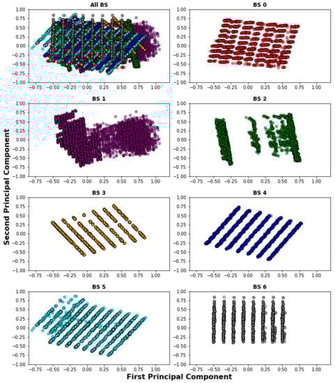 The purpose of this phase is to find out whether the extracted features provide differentiated patterns for each BS. To this end, we analyze the samples of the seven BS by using the principal components analysis (PCA). PCA is an unsupervised ML technique widely used for data visualization and feature selection. PCA is a linear transform that maps the data into a lower dimensional space, known as the principal subspace, preserving as much data variance as possible, i.e., with minimum loss of information []. Since our features are frequency, data rate, latitude, longitude, time of the day, and day of the week, the original dimension of our data is a matrix , where and . In this way, our objective is to project the data of each BS into two dimensions, i.e., , in order to visualize and verify that the extracted features do show a distinctive pattern. Therefore, for each BS there are samples and PCA will produce two vectors of elements, corresponding to the first two principal components. These vectors are computed as follows: