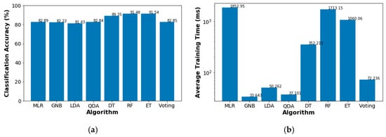 To select a specific classification method, we compare the accuracy and the computational time of several algorithms, such as multiple logistic regression (MLR), Gaussian naive Bayes (GNB), Linear Discriminant Analysis (LDA), Quadratic Discriminant Analysis (QDA), and Decision Trees (DT). In addition, we include in our comparison some ensemble methods such as the Random Forests (RF), Extra Trees (ET) and a voting classifier. Details about the algorithms behind these classifiers can be found in [,,].