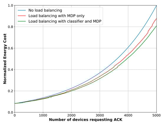 Figure 9 depicts the resulting graphs of the system simulation in terms of PDR. As can be seen, the proposed scheme performs better when the outcomes from the classifier are taken into account, particularly in the circumstances when many devices are requesting DL traffic (note that the MDP-only load balancing method outperforms the combined method just when the number of devices is small, i.e., between 0 and 300 devices, roughly). However, there is a trade-off between the PDR improvement and the computational time, Figure 10. We point out that in this comparison we only consider the classifier’s prediction time, in other words, we do not include its training time, as we assume that the Network Server has previously trained the model. It is noticeable that when the proposed scheme uses the association biasing based on the predicted classes, the MDP needs more time to make a decision on load balancing. It is also important to highlight that the graph show some peaks, which means that the iteration algorithm employed more iterations to find . Because of the stochastic nature of the samples, the algorithm might have dealt with tough values to determine . However, we can see that in those cases, although more time was needed, the goal of improving the PDR was achieved.