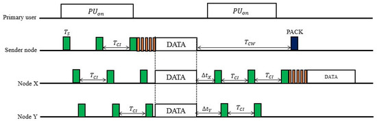 In the first condition (the channel is occupied by PU), the node goes to sleep mode for duration of checking interval . In the second condition (sensor node transmission), the node determines whether it should discard its own data or transmit it, which is determined by checking the sequence number of the transmitted data. The data packet is discarded if the sequence number of the transmitted data resembles with its own data packet. Finally, in the third condition (channel is idle), the node transmits the data packet as it is deemed to be a winner node. In Figure 4, node is the winner node and it forwards the data packet.