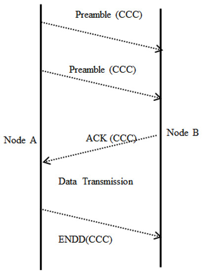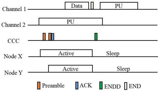 Each sensor node follows a sleep/active cycle and senses all the data channels, thus storing the status of each channel in a vector at the start of each cycle. Each node listens to the CCC while active and, if a data transmission request is not found, switches to sleep mode. Otherwise, after receiving data transmission request, the receiving node resets its timer and sends an acknowledgement (ACK) message (which contains the ID of the data channel to be used) on the CCC to ensure that data transmission is carried out on the selected channel, as shown in Figure 7. Since the transmission process on a data channel is considered to be the combination of packet transmission and channel sensing intervals, a periodic sensing approach is used in order to mitigate interference between PUs and SUs. The senders and receivers discard a packet if the presence of a PU is detected and leave that particular data channel free from SU transmissions. Finally, an end of data (ENDD) is broadcasted on the CCC so that other nodes listening to the CCC update their channel state vector accordingly. The ENDD contains identifiers containing information about the latest sensing results obtained by the pair of nodes taking part in the transmission on that data channel. Figure 8 depicts the communication flow described above.