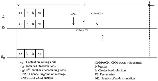 More importantly, frame length varies dynamically as per the number of nodes to achieve an improved network performance. The protocol provides strong criteria for determining how each of the secondary users chooses the appropriate channel at the appropriate time. It is a multichannel MAC protocol with dynamic channel selection making sure that communication among primary users is not hindered. This is achieved by dividing the system time into fixed time intervals, as shown in Figure 2. Each time window is allocated for a certain purpose, and this process has been rightly named as the channel-slot aggregation technique. A communication segment is allocated for each channel and time slot, denoted by the pair (l, t), where l is the channel and t is the time slot. A communication segment can be occupied, free or tentatively assigned based on the status of the channel involved (whether it is in use, free or is likely to be used in the next segment).