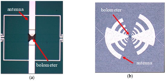 Figure 1a,b present two versions of several variants, which were designed and fabricated to cover the main THz sub-regions for the different applications []. In Figure 1a,b the receiving antenna and micro-bolometer sensing element are marked. The main driving factor of the different antenna band fabrication is in the change of material response (transmittance and absorbance of the materials) [] and the fact of different absorption of THz waves, due to water vapor in the air.