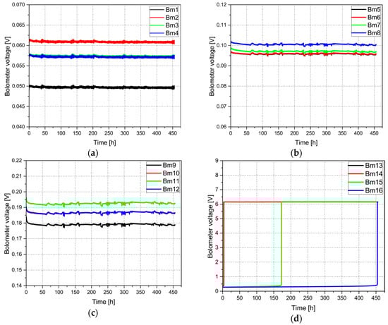 The last case (Figure 4d) shows how the micro-bolometers were burned out—the Zener protection diode (VZ = 6.2 V) limited the voltage in that case. First, the micro-bolometers Bm13 (black) and Bm14 (red) were burned, then after 170 h Bm15 and at the end of monitoring at 455 h the last one, Bm16, was also destroyed.