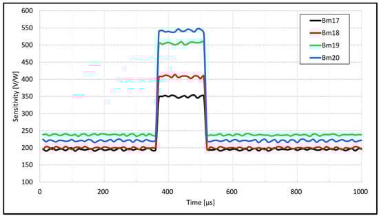 Figure 5 presents the results of sensitivity measurements of four micro-bolometer sensors (Bm17–Bm20) with changed biasing for a certain amount of time. The sensors were taken from different lots. The boosting can be done only for short time period and image should be saved at that moment. Even if the THz sensors survived operation for a long time at higher current, their lifetime would be shorter. The basic biasing current used in this case was 200 µA for normal screening mode measurements and 400 µA for high sensitivity mode. The high sensitivity turn-on time was at 360 µs and turn-off at 510 µs. The rise and fall times for current switching were chosen to be around 1 µs, allowing the sensor to heat up or cool down as the sensor thermal time constant is 0.5 µs []. It can be noted that the sensors have different base sensitivity, as well as high sensitivity. This is in the majority of cases due to different thermal constants and initial resistances. As the sample sensors were taken from different lots, this behavior is expected. The values of base sensitivities are around 220 V/W and at higher current value are more scattered—from 350 V/W up to 540 V/W. The ratio between basic current and boosting current and basic sensitivity and boosted sensitivity is not the same for all sensors, mainly due to their different thermal constants and because of small variations in micro-bolometer dimensions. The proposed sensitivity measuring method will give enough data to predict and react accordingly to equalize the sensitivity and prevent possible burnouts. All sensors were measured at room temperature without vacuum encapsulation. In the case of encapsulation in vacuum, the sensitivities would be at least doubled.