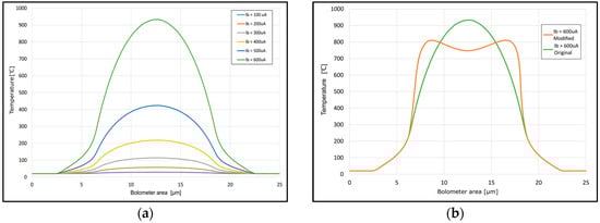 From the Figure 7b, it can be seen that when the design shown in Figure 6b with wider micro-bolometer central area is used, the temperature decreases due to the lower current density. It can be concluded that in this case, a higher biasing current could be used and therefore higher sensitivity can be reached.