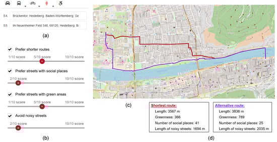 Main components of the proposed pedestrian routing system. (a) Origin and destination addresses are defined by the user. (b) Slide-bars to set the strength of influence of the different factors in the extraction of the customized route. (c) The system’s screen displays the shortest route (in red) and the customized route (in purple) over the OpenStreetMap layer. (d) A quantitative comparison between the shortest and customized routes in regard to the four factors is provided. The greenness variable is the street segment’s length multiplied by the relative area of the green areas inside its viewshed (see Section 3.2).