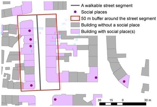 Example of a street segment and a 50 meter buffer zone around it. OpenStreetMap features intersecting the buffer and containing at least one of the tags indicate third places (Table 1) and were considered for the measurement of the street segment’s sociability.
