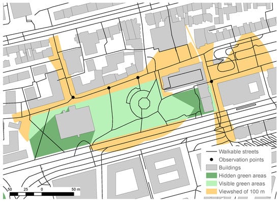The computation of the greenness of street segments was preceded by the selection of OSM features with at least one of the tags presented in Table 2 that are considered to indicate green areas. Observation points were then established at the beginning and end of each street segment shorter than 50 m. For longer street segments, n = equidistant observation points was established (in practice, n was rounded to its closest integer). Subsequently, the viewshed in a radius of 100 m was computed for each of these observation points. These viewsheds were merged and the green areas intersecting the merged viewshed were extracted. This process is depicted in Figure 3. Finally, the relative visible green area inside the merged viewshed was computed. The greenness factor g of each street segment i was then given by