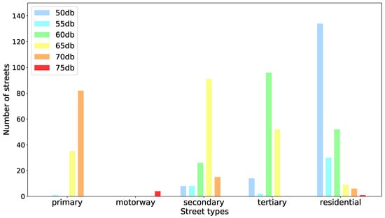 Regarding the quietness factor, the street segments in OSM were grouped into two categories according to their highway/street type tag, namely, ‘noisy’ and ‘less noisy’. As shown in Table 3, the OSM highway type tags were associated with noise factors of 1 or 2. Following, the quietness factor of each street segment was computed by dividing its length by the noise factor associated with its highway type tag. Although this is a very simplified way to describe the quietness of streets, we took into account that the main source of noise in urban areas is car, truck, and bus traffic []. Furthermore, based on official noise intensity data from the city of Heidelberg (Germany)—the test-site of our system’s prototype—we observed a consistent correlation of higher and lower noise intensity levels with street segments associated with noise factors 1 and 2, respectively. Figure 4 depicts the distribution of noise intensity levels for each highway type from OSM. Based on a visual analysis of these distributions, noise factors were associated with OSM highway types according to Table 3.