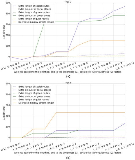 Graph plots of the metric computed for two trips, shown in (a) and (b), and the eleven discrete weight pairs summing to 10, i.e., (10,0),…,(0,10). Each pair of weights were applied to the length (L) and to the greenness (G), sociability (S), or quietness (Q) factor separately.