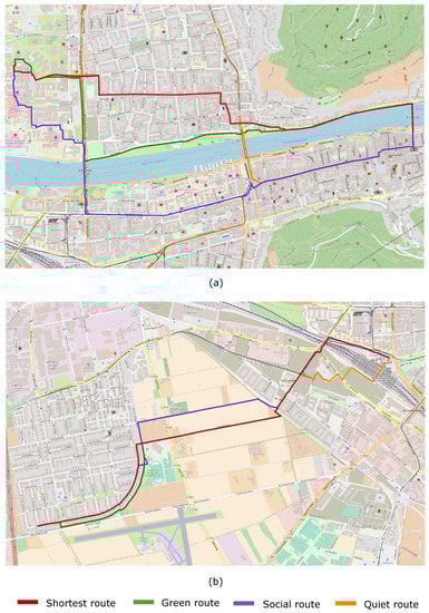 The lengths of the street segments were considered in the computation of the greenness, sociability, and quietness factors, because our intention was that the alternative routes extracted by the system would not be significantly longer than the shortest routes but have significantly less noisy meters as well as more green areas and social places, depending on the user-defined factor weights and the city structure, of course. Thus, we assumed that, most of the time, users of our system will not be willing to make very long detours for the sake of pleasant walking, which is usually the case in more rare situations, like touristing or city exploration. Our assumption is corroborated by the seminal work of Seneviratne et al. [] where evidence is given that distance is the strongest factor in pedestrian route choice. A more practical justification is that, even if the length factor has a strong weight, very long and complex routes are obtained if the length is not also considered in the computation of the other factors.