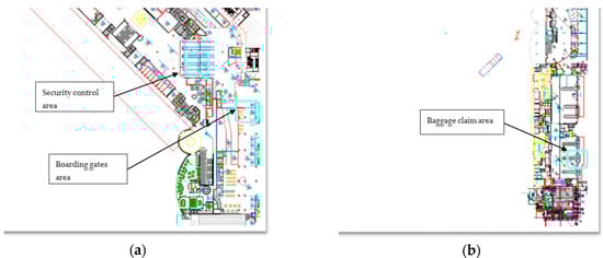 Terminal areas selected for monitoring phase: (a) security check lines and boarding gates (1st floor); and (b) baggage claim area (ground floor).