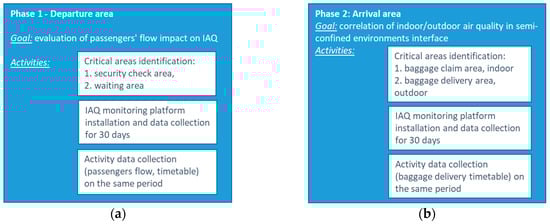 Experimental set-up and flow chart of activities, for phase 1 (a), when Departure area of the Terminal was involved, and phase 2 (b), when Arrival area was investigated.