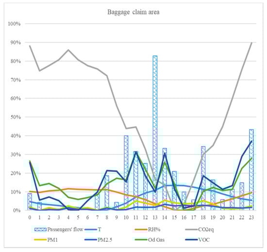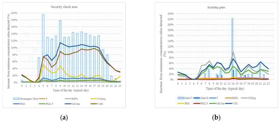 Passengers’ flows resulted the main driving force in gaseous contaminants’ concentration trends (i.e., VOC, odorous gases (OD), and CO2 equivalent), displaying similar behavior during the typical day. The primary peak in the area’s activity, registered again, at 2 p.m., in this case outnumber the peak registered on airborne contaminants (e.g., 225% increase over the minimum registered value in passengers’ flow against 100% increase over the minimum registered value in VOC). Particulate matter, on the other hand, shows lower variability on the typical day profile (i.e., values range in a +8% range over the minimum).
