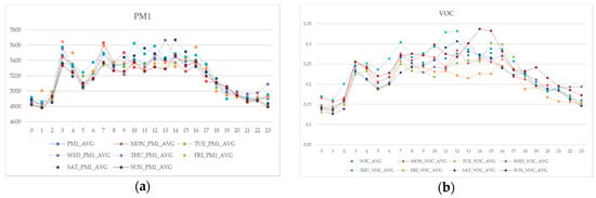 Hourly average values for particulate matter (a) and volatile organic compound (b) over different days of the week.