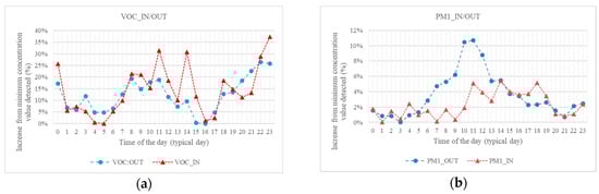 A comparison of airborne contaminants profile, detected at the interface outdoor/indoor, has been performed and the results obtained show, for VOC, an evident correlation between the two environments, with minimum values in the small hours and afternoon and peaks in the central hours of the typical day and at nighttime (possibly following what detected on CO2 equivalent sensor), but with higher variation over indoor values. This suggests that the indoor environment, in this case, is both affected by the anthropic activity indoor and outdoor (Figure 7a).