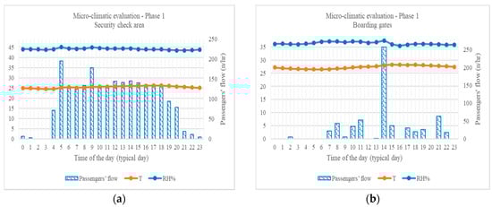 Micro-climatic evaluation, Phase 1, in terms of temperature and relative humidity, typical day profile: (a) security check area; and (b) boarding gate area.