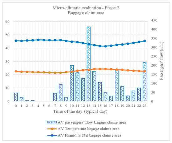 Micro-climatic evaluation, Phase 2, baggage claim area, in terms of temperature and relative humidity, typical day profile.