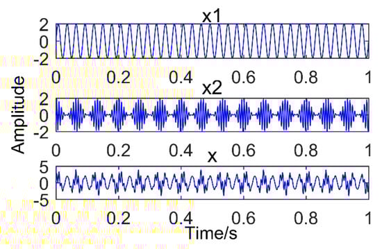 Time domain graph of Simulation signal, x1: sinusoidal signal; x2: Modulation signal; and x: Synthetic signal.