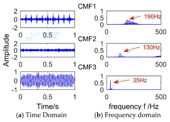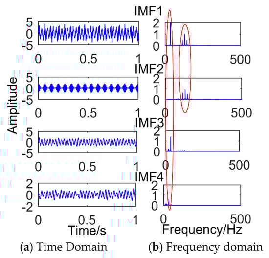The model was established in the MATLAB environment and is shown in Figure 1. The MATLAB used was developed by MathWorks Inc. in Natick, Massachusetts, USA. The version is 2016. Figure 1 is the time domain graph of the simulated signal, Figure 2 is the result of the simulation signal decomposed by SSD, and Figure 3 is the result of the simulation signal decomposed by EEMD. Where, in this paper, the abscissa axis of all time-domain pictures is time and the ordinate is amplitude. The abscissa axis of all frequency-domain pictures is time and the ordinate is amplitude. It can be seen intuitively that the performance of SSD is more excellent, the decomposed components are almost identical with the simulation signals, and there is no modal mixing and pseudo-component. However, the result of EEMD produces many pseudo-components (the decomposition results are nine layers, and only the first four layers are depicted in the diagram). Furthermore, it can be seen intuitively from Figure 3 that IMF 2 and IMF 3 have the same frequency of 35 Hz. Therefore, there is modal mixing phenomenon in EEMD, which shows that the performance of SSD is more reliable.