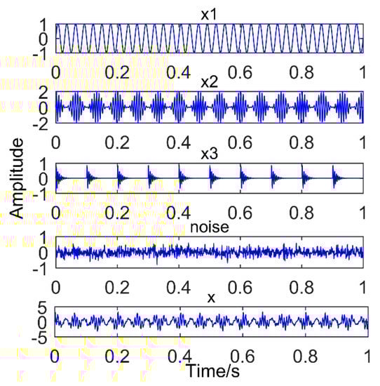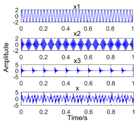 Simulated signal, x1: sinusoidal signal; x2: Modulation signal; x3: periodic impact signal; and x: Synthetic signal.