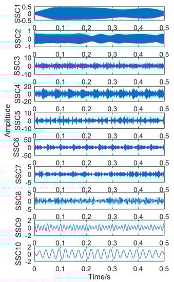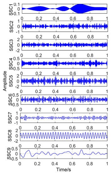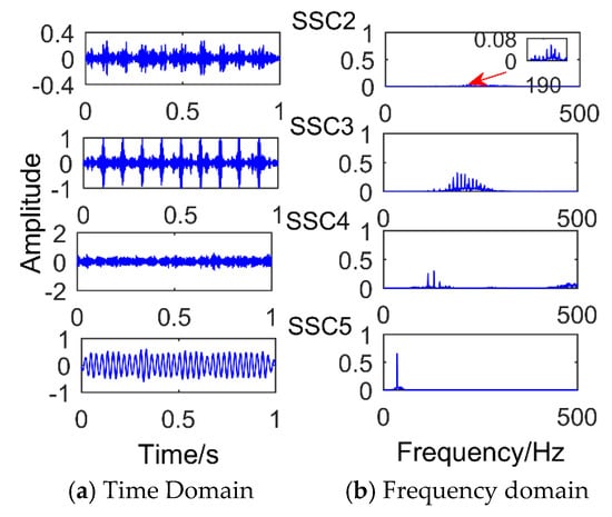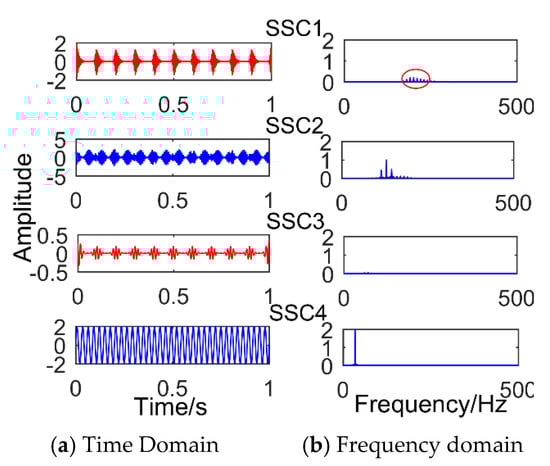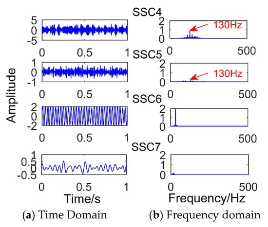 Figure 5 is time-domain diagram of the simulation signal. Figure 6 is the decomposition result of SSD method after adding impact signal with amplitude of 3.5. It can be observed that the decomposition result is defective compared with the decomposition modulation signal. It is obvious that there is a slight modal mixing phenomenon. The components SSC1 and SSC3 are all the components of the impact signal. The red box in the figure is the frequency corresponding to SSC1, and its value is 190. The intervals of frequencies around it are 10 Hz, which corresponds to a period of 0.1 s. However, it can be observed that the frequency amplitude of the decomposed impact signal is only 0.1352, which is easily submerged by noise. Furthermore, if a weak impact signal is decomposed, the shock signal is almost invisible. When the amplitude of the added impact signal is less than one, the SSD method will not extract the impact signal. As shown in Figure 7 (the amplitude of the added impact signal is one), only the sinusoidal signal and the modulated signal can be decomposed. Figure 8 shows the result of SSD decomposition when the signal is added to noise (amplitude is 0.5) and impact signals (amplitude is 3.5). The decomposition results have nine layers, the first three layers are noise components, and Figure 8 shows only three meaningful components (SSC4, SSC5, and SSC6) and one meaningless component (SSC7). It can be observed that the impact signal is submerged by noise, and the frequency of the impact signal does not appear in the frequency domain diagram. Moreover, after adding noise, a lot of meaningless pseudo components and modal aliasing will appear. The components SSC4 and SSC5 are all the components of the modulated signal.