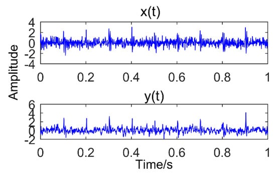 Figure 9 shows the result of the signal being processed by MEDA (length of filter is 20). In the figure, x(t) is the original signal and y(t) is the result obtained by MEDA. It can be observed that the noise is reduced and the amplitude of the shock signal is significantly increased. To quantify the ability of MEDA to enhance the impact signal, the kurtosis of x(t) and y(t) is calculated. The kurtosis increased from 1.9262 to 5.6778, nearly tripling.