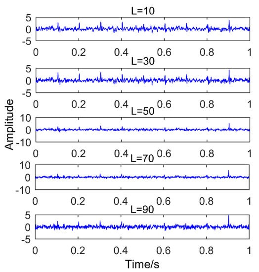 However, the ability of MEDA to reduce noise and enhance impact components largely depends on its parameter, L, which is the length of filter. Figure 10 shows the results obtained by MEDA for processing the simulated signal when changing the length of filter. Table 1 is the kurtosis value corresponding to the obtained results.