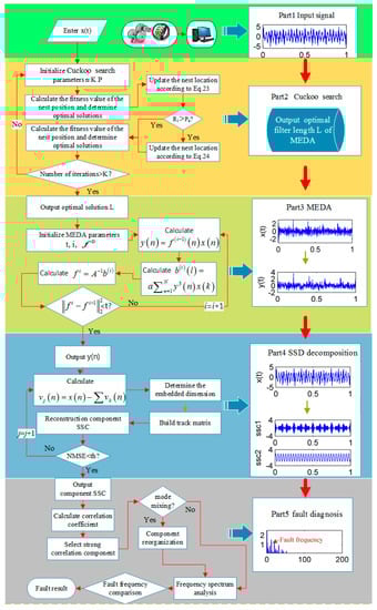 Based on the above analysis, an improved SSD method is proposed for compound fault diagnosis of gearbox. The SSD algorithm has a poor effect on extracting weak impact signals and is susceptible to noise. The MEDA algorithm can not only reduce noise, but also enhance the impact signal, which can well overcome the limitations of the SSD algorithm. Firstly, the objective function is constructed and used as the optimization target of the CS optimization algorithm. Then, CS algorithm is used to improve the MEDA algorithm. The improved MEDA algorithm is used as a pre-filter to denoise the signal and enhance the impact component. The processed signal is decomposed by SSD algorithm, and then, according to the correlation coefficients of each component and the original signal, the components with weak correlation are eliminated, and the SSC components with strong correlation are selected for analysis. Aiming at the phenomenon of mode mixing when SSD decomposes composite signals under the background of strong noise, this paper proposes a modal component reconstruction method to suppress the effect of mode mixing on the result discrimination. Finally, the reconstructed components are analyzed by frequency spectrum to extract features and identify faults.