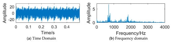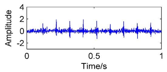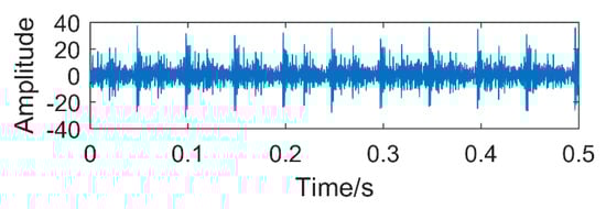 Gears and bearings are the key components of the gearbox, which play a key role in the mechanical transmission of the gearbox. When the gears have broken teeth, cracks and other faults, the vibration signal collected by the sensor will appear as frequency transfer and frequency modulation phenomenon. When a bearing (inner ring, outer ring, rolling element) has a crack or another fault, a periodic impact will occur in the vibration signal collected by the sensor. The frequency at which the impact occurs is the passing frequency of the inner and outer rings of the bearing []. When the gear and the bearing in the gearbox fail at the same time, the frequency of the gear fault characteristic is different from the frequency of the bearing fault characteristic. Therefore, according to the difference of the frequency, the compound fault of the gearbox can be diagnosed. Frequency spectrum is a common signal analysis method, which can quickly and effectively extract frequency information from vibration signals []. However, because the working environment of the gearbox is often harsh, the fault characteristic information is often submerged in a strong background noise environment. It is not suitable to carry out frequency spectrum analysis directly to the signal and it needs to reduce noise in advance [].