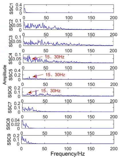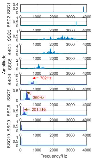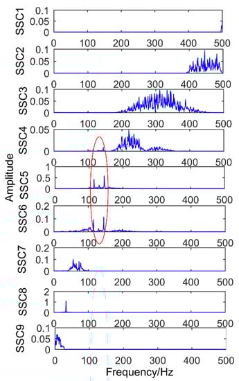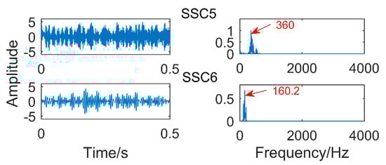 Then, SSD algorithm is used to process the signal and get 8 components. The correlation coefficient between each SSC component and the original signal is calculated, and the strongly correlated component (coefficient greater than 0.2) is selected for analysis. The results are shown in Figure 33. Table 5 shows the correlation coefficients of each component. Only SSC5 and SSC6 meet the conditions, and the other components are discarded. Figure 31 shows the time domain and frequency domain diagrams of SSC5 and SSC6. Obviously, there is no modal mixing. Moreover, as shown in Figure 33, it can be easily found that the frequency corresponding to SSC5 is 360 Hz, which is the frequency of gear fault. The frequency of component SSC6 corresponds to 160.2 Hz, which is the frequency of bearing fault.