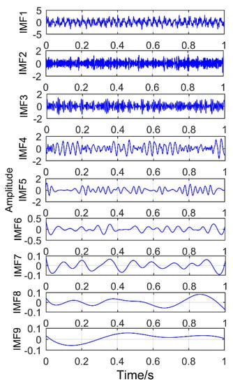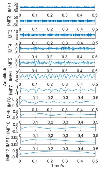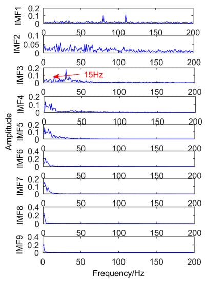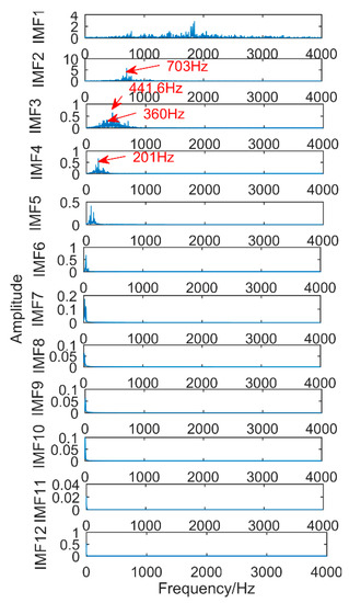 The obtained vibration signal was analyzed by the EEMD method, and the obtained decomposition results are shown in Figure 30 and Figure 31. As shown in Figure 31, the signal is decomposed into 12 layers, the first layer contains a lot of noise, and the corresponding frequency of the second layer is close to the double frequency of the gear failure. The third layer has amplitude at frequency 360 Hz, but it is not the maximum amplitude. The maximum amplitude is 441.6 Hz, which is a meaningless interference frequency, indicating that there is great noise interference. The fourth to twelfth layers are meaningless interference components. Obviously, EEMD method cannot extract all the fault frequencies. Compared with SSD method, it not only has more pseudo components, but also the extracted gear fault frequency is not clear.