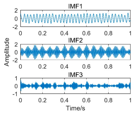 As shown in Figure 23 and Figure 24, IMF1 is the components of the sinusoidal signal, IMF2 is the components of modulated signals and IMF3 is the components of impact signals. Although the MVMD method extracts all fault frequencies successfully and there is no modal mixing, amplitude of the impact component is smaller than the proposed method. More importantly, the threshold of permutation entropy in the MVMD method needs to be selected by experience, which makes MVMD not an adaptive method. Choosing different thresholds will produce more different results. Therefore, compared with MVMD, the proposed method should be selected with higher priority to extract the composite fault of the gearbox.
