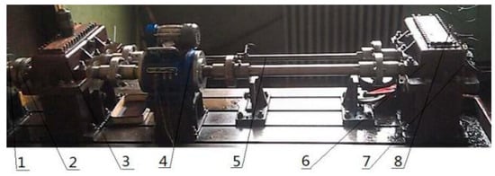 Experiment platform. 1—Speed-adjustable motor, 2—Coupling, 3—Accompanied gearbox, 4—Speed reversing instrument, 5—Torsion bar, 6—Test gearbox, 7—Acceleration sensor 1#, and 8—Acceleration sensor 2#.