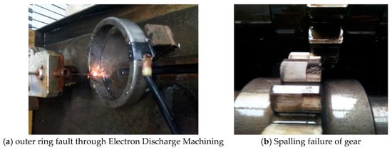 To obtain the compound fault, the groove of 3 × 2 was machined by Electron Discharge Machining on the outer ring of the bearing, and the gear with pitting was used to carry out the experiment. The specific fault is shown in Figure 26. The number of gear teeth is 18 and the bearing type is 32,212. The type of accelerometer for collecting vibration signal is YD77SA. Its sensitivity is 0.01 v/ms2, and its installation location is shown in Figure 25. During the experiment, the shaft speed was 1200 r/min, the sampling frequency was 8000 Hz, and the sampling point was 4096. The calculated fault frequency is shown in Table 4.