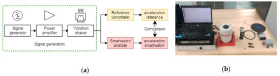 This section has been divided into six subsections. Section 2.1 describes the technical characteristics of the built-in accelerometers from the smartwatches used in the tests. Section 2.2 describes the test bench used in the calibration and measurement tests. Section 2.3 details the development of the vibration measurement system for the Android test devices. Section 2.4 presents the process of calibration and adjustment of the implemented measurement system in the devices, before performing frequency and amplitude tests. Section 2.5 describes the frequency response measuring process of the test devices at different amplitudes. Lastly, Section 2.6 presents the procedure used to perform the analysis of uncertainties associated with calibration and measurements.