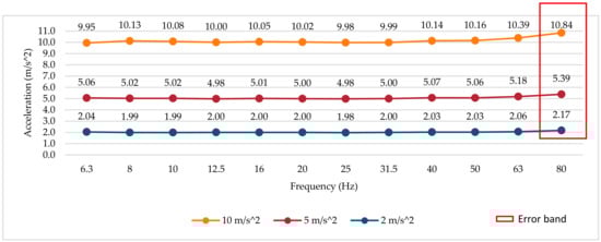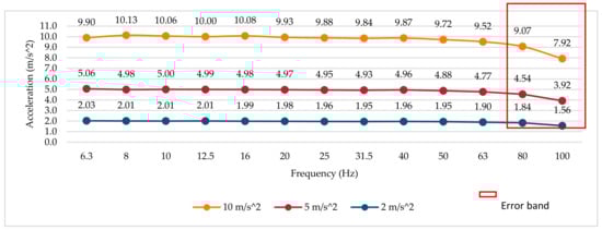 The calibration of the devices can be performed at any frequency and amplitude within the operational limits of the device. The ISO 16063-21:2003 [68] standard recommends using the standardized third-octave frequencies indicated in ISO 266:1997 [71] and amplitudes of 1, 2, 5 or multiples of 10 m/s2.