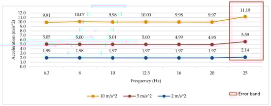 The mechanical test signals were generated with the vibration shaker fed by discrete sinusoidal waves at third-octave intervals, with central frequencies in the range of 6.3–100 Hz. The frequencies were selected based on the maximum frequency analysis of each device according to Nyquist’s theorem [67]. The vibration amplitudes used in the test were 10, 5 and 2 m/s2 RMS.