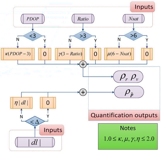 According to Figure 2, the adaptive measurement noise covariance matrix reconfiguration algorithm is formulated as the following equation. The algorithm is used to determine the driving state or measurement reliability based on the quantification results (, and ), which can be equal or close to 0 when the GPS-RTK solution is reliable. Otherwise, state uncertainties larger than can occur in the instance when the measurement is less reliable. The factors mentioned in Figure 2, like PDOP and ratio, are directly related to positioning performance [,,,,]; hence, the proposed measurement noise covariance matrix remodification method is more feasible and flexible compared with the adaptive robust method in Equation (27).